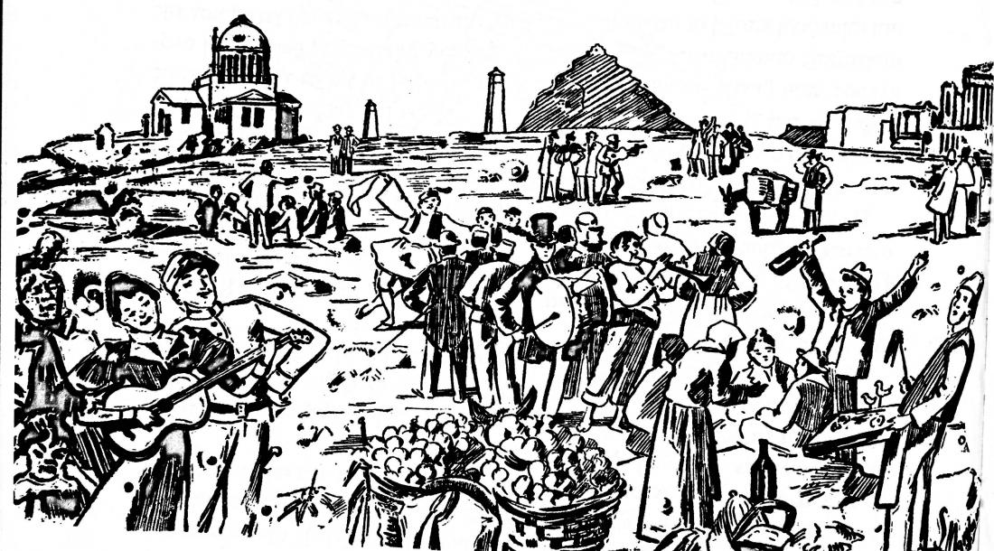 (Σκίτσο από το βιβλίο των εκδόσεων Polarris με λεζάντα του Γιώργου Χατζηδάκη: «Στο σκίτσο της εφημερίδας Ακρόπολις οι γιορταστές της Σαρακοστής εν χορδαίς και οργάνοις προσδιορίζουν με ακρίβεια το σημείο του εορτασμού με την Ακρόπολη στα δεξιά, τον Λυκαβηττό στο βάθος και το Αστεροσκοπείο στο κέντρο. Ο ζωγράφος Σπύρος Μαντζάκος δεν μας αφήνει καμία αμφιβολία πως το γλέντι στήνεται στο μνημείο του Φιλοπάππου»).