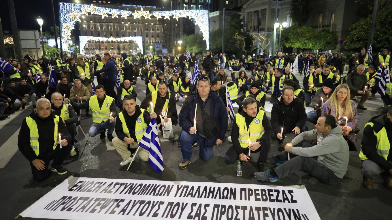 Σε καθιστική διαμαρτυρία προχώρησαν το απόγευμα της Δευτέρας (18/12/2023) εκατοντάδες ένστολοι από όλα τα Σώματα έξω από τη Βουλή.