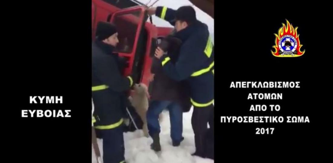 "Αν δεν ήσασταν εσείς θα πεθαίναμε!", είπε μία γυναίκα που απεγκλωβίστηκε στην Κύμη μαζί με τον σύζυγό της από άντρες της Πυροσβεστικής, από το σπίτι τους που είχαν εγκλωβιστεί, στον οικισμό Σουτσίνι Κύμης. Το βίντεο από την επιχείρηση έδωσε σήμερα στη δημοσιότητα η Πυροσβεστική.