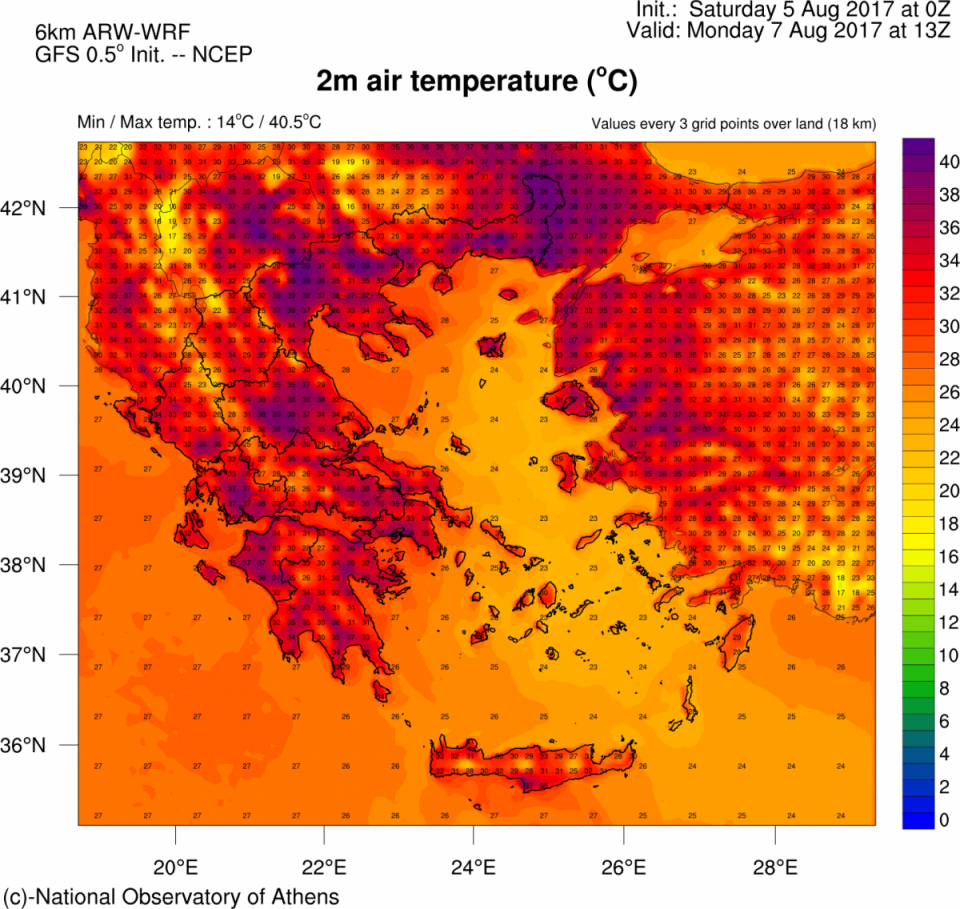 Την Κυριακή 06/08/2017 μέγιστες θερμοκρασίες 39-40 βαθμούς θα σημειωθούν σε περιοχές της Δυτικής Πελοποννήσου, Δυτικής Στερεάς, της Κεντρικής Μακεδονίας, της Θράκης, ενώ στα υπόλοιπα ηπειρωτικά τμήματα και τα νησιά του Ανατολικού Αιγαίου οι μέγιστες τιμές θα φτάσουν τους 37-38 βαθμούς Κελσίου (Χάρτης Αριστερά). Στα υπόλοιπα νησιά του Αιγαίου η μέγιστη θερμοκρασία δεν θα ξεπεράσει τους 33 βαθμούς Κελσίου, λόγω της μέτριας έντασης του μελτεμιού (στη Νότια Κρήτη θα φτάσει τους 34-35 βαθμούς).