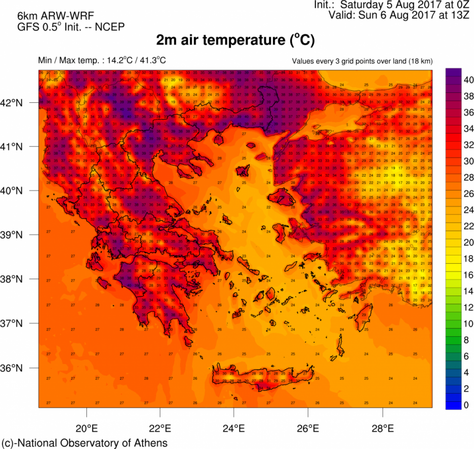 Την Κυριακή 06/08/2017 μέγιστες θερμοκρασίες 39-40 βαθμούς θα σημειωθούν σε περιοχές της Δυτικής Πελοποννήσου, Δυτικής Στερεάς, της Κεντρικής Μακεδονίας, της Θράκης, ενώ στα υπόλοιπα ηπειρωτικά τμήματα και τα νησιά του Ανατολικού Αιγαίου οι μέγιστες τιμές θα φτάσουν τους 37-38 βαθμούς Κελσίου (Χάρτης Αριστερά). Στα υπόλοιπα νησιά του Αιγαίου η μέγιστη θερμοκρασία δεν θα ξεπεράσει τους 33 βαθμούς Κελσίου, λόγω της μέτριας έντασης του μελτεμιού (στη Νότια Κρήτη θα φτάσει τους 34-35 βαθμούς).