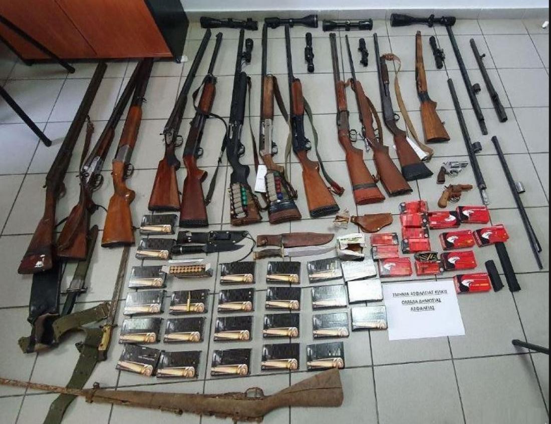 Σύμφωνα με ανακοίνωση της ΕΛ.ΑΣ. κατά την έρευνα στους παραπάνω χώρους κατασχέθηκαν οκτώ κυνηγετικά όπλα, για τα οποία ο 63χρονος δεν διέθετε την απαιτούμενη άδεια, δύο περίστροφα (από τα οποία το ένα μη λειτουργικό), δύο ξιφολόγχες, τέσσερις κάνες όπλων, τρία κυνηγετικά μαχαίρια, επτά διόπτρες, δύο γεμιστήρες πιστολιού και 1.276 φυσίγγια διαφόρων διαμετρημάτων. Επιπλέον, κατασχέθηκαν δύο μη λειτουργικά όπλα (το πρώτο πολεμικό τυφέκιο και το δεύτερο κυνηγετικό), όπως επίσης δύο ακόμη κυνηγετικά όπλα, για τα οποία διέθετε άδεια αλλά διαπιστώθηκε ότι παραβίασε τους όρους της ασφαλούς τους φύλαξης.