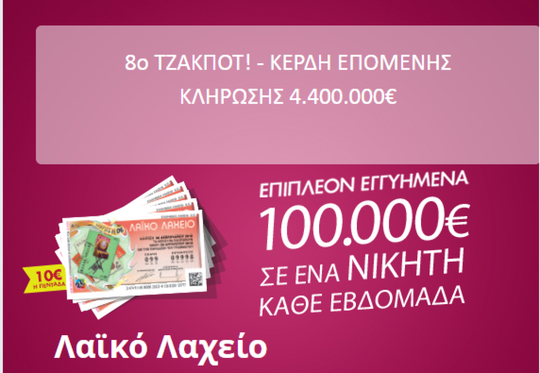 Να σημειώσουμε, ότι στην του Λαϊκού Λαχείου , σημειώθηκενέο,όγδοο τζακ ποτ και έτσι στην σημερινή κλήρωση θα έχουμε συνολικά κέρδη 4,4 εκατομμύρια ευρώ
