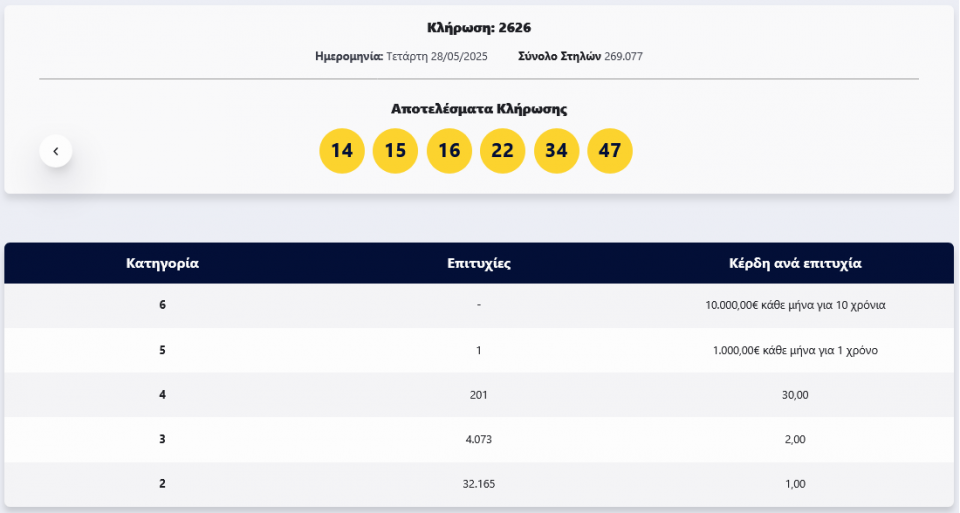 Οι τυχεροί αριθμοί είναι: 14, 15, 16, 22, 34, 47