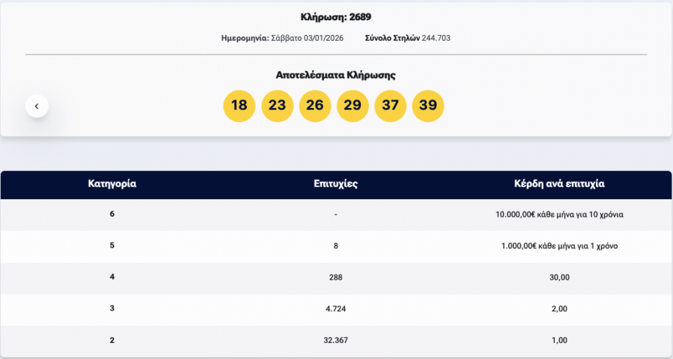 Οι τυχεροί αριθμοί είναι: 18, 23, 26, 29, 37, 39.