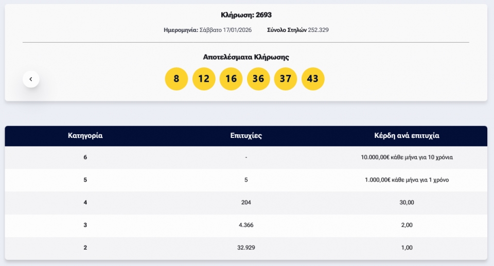 Οι τυχεροί αριθμοί είναι: 8, 12, 16, 36, 37, 43