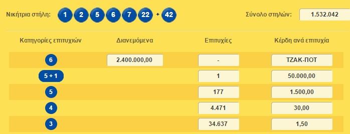 Το ποσό των 2.500.000 ευρώ μοιράζει στην κλήρωση του Σαββάτου (01/10) το Λόττο μετά τα διαδοχικά Τζακ Ποτ. Στην προηγούμενη κλήρωση δεν βρέθηκε νικητής στην πρώτη κατηγορία.