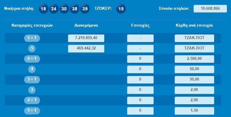 Οι τυχεροί αριθμοί που βγήκαν από την κληρωτίδα είναι 18,24,30,38,39 και αριθμός τζόκερ το 15.