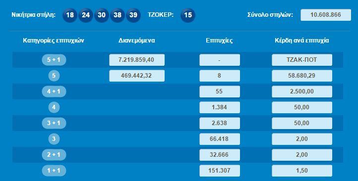 Στην προηγούμενη κλήρωση της Κυριακής 08/05 σημειώθηκε νέο ΤΖΑΚ ΠΟΤ , αφού κανείς δεν μάντεψε τους αριθμούς 18,24,30,38,39 και τζόκερ το 15 που έβγαλε η κληρωτίδα.