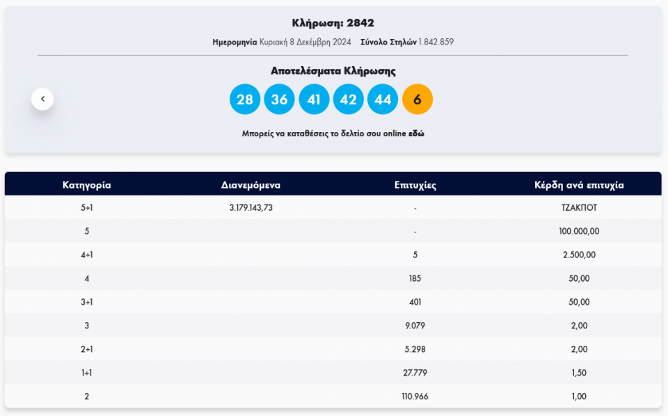 Κλήρωση Τζόκερ 2842 (8/12/2024): Αυτοί είναι οι τυχεροί αριθμοί που κερδίζουν