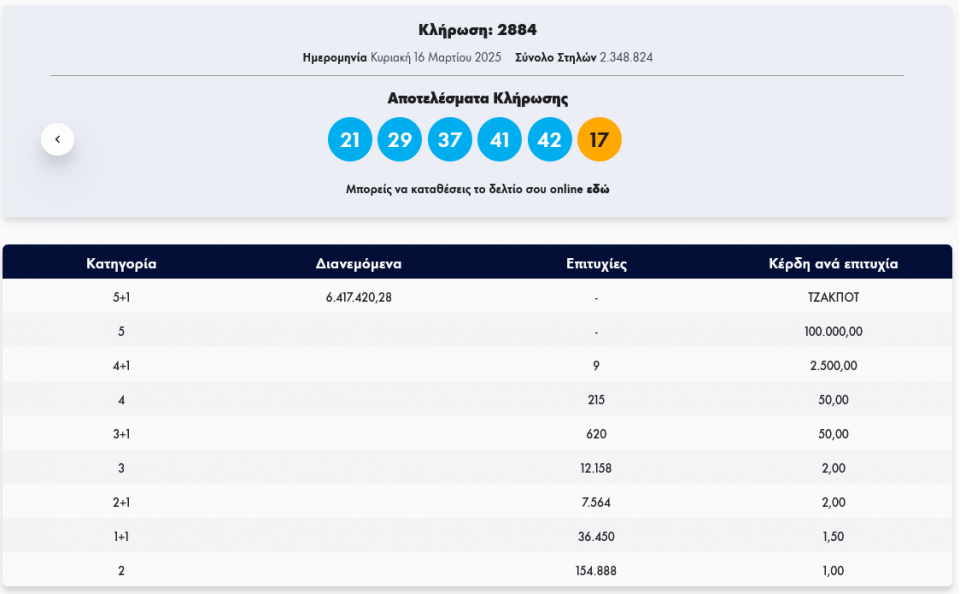 Κλήρωση Τζόκερ 2884 (16/3/2025): Αυτοί είναι οι τυχεροί αριθμοί που κερδίζουν