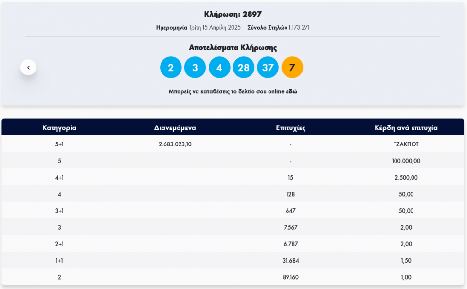 Κλήρωση Τζόκερ 2897 (15/4/2025): Αυτοί είναι οι τυχεροί αριθμοί που κερδίζουν