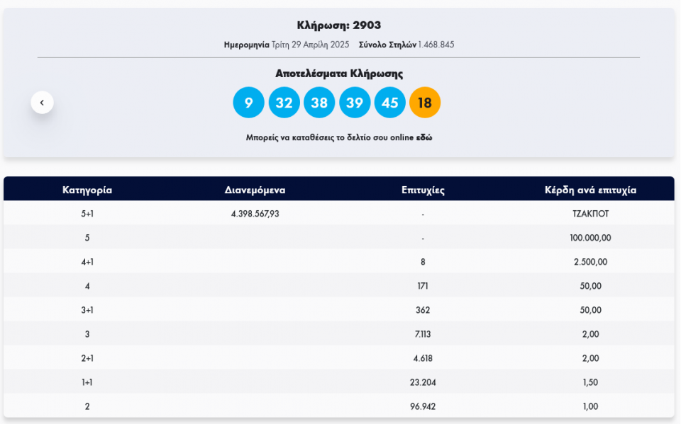Κλήρωση Τζόκερ 2903 (29/4/2025): Αυτοί είναι οι τυχεροί αριθμοί που κερδίζουν