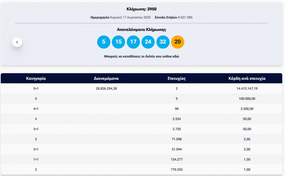 Πραγματοποιήθηκε σήμερα Κυριακή 17/8/2025 η Κλήρωση Τζόκερ 2950.