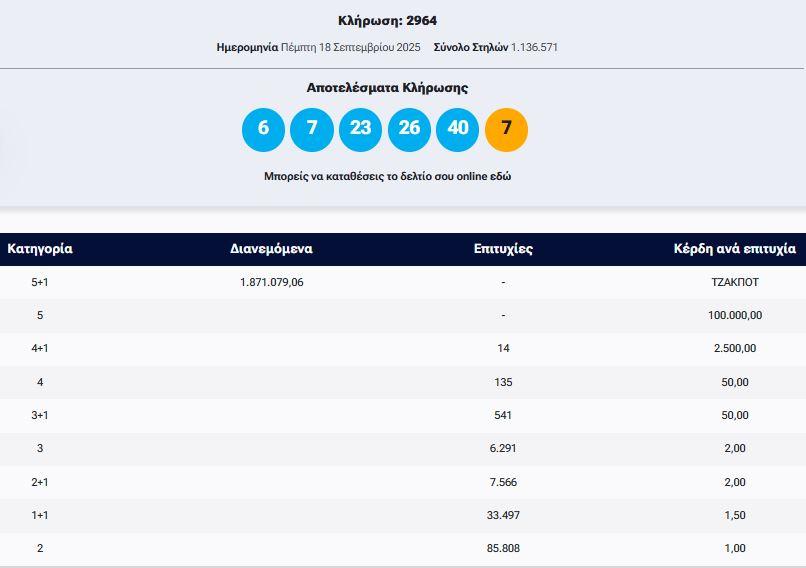 Κλήρωση Τζόκερ 2964 (18/9/2025): Αυτοί είναι οι τυχεροί αριθμοί που κερδίζουν