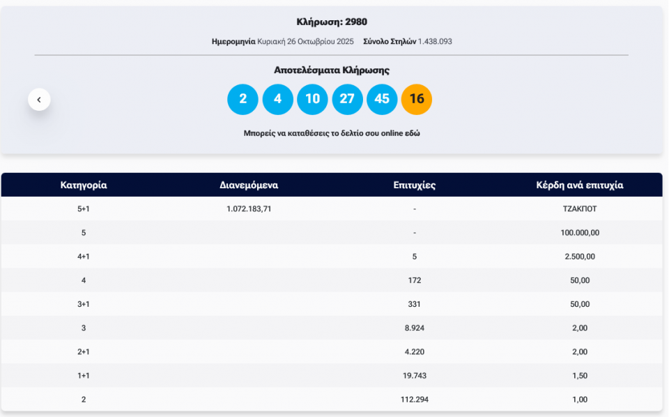 Κλήρωση Τζόκερ 2980 (26/10/2025): Αυτοί είναι οι τυχεροί αριθμοί που κερδίζουν