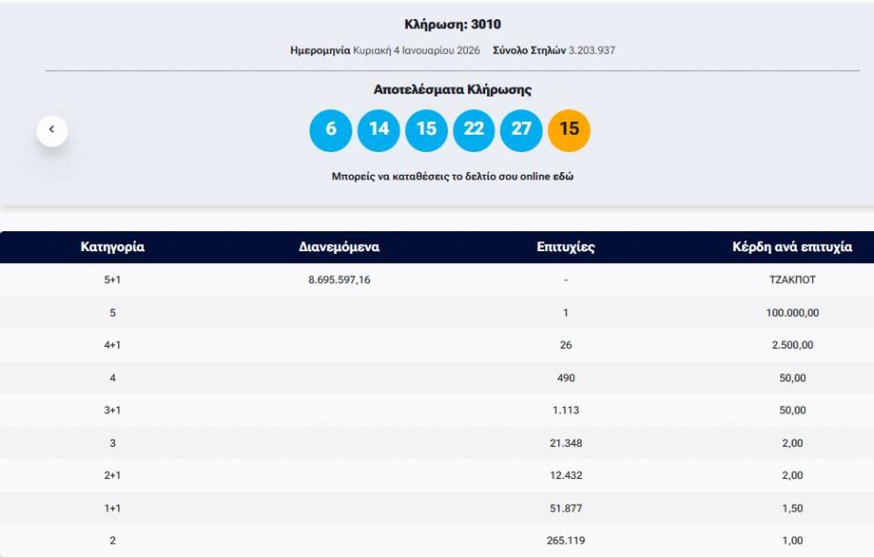 Κλήρωση Τζόκερ 3010 (4/1/2026): Αυτοί είναι οι τυχεροί αριθμοί που κερδίζουν