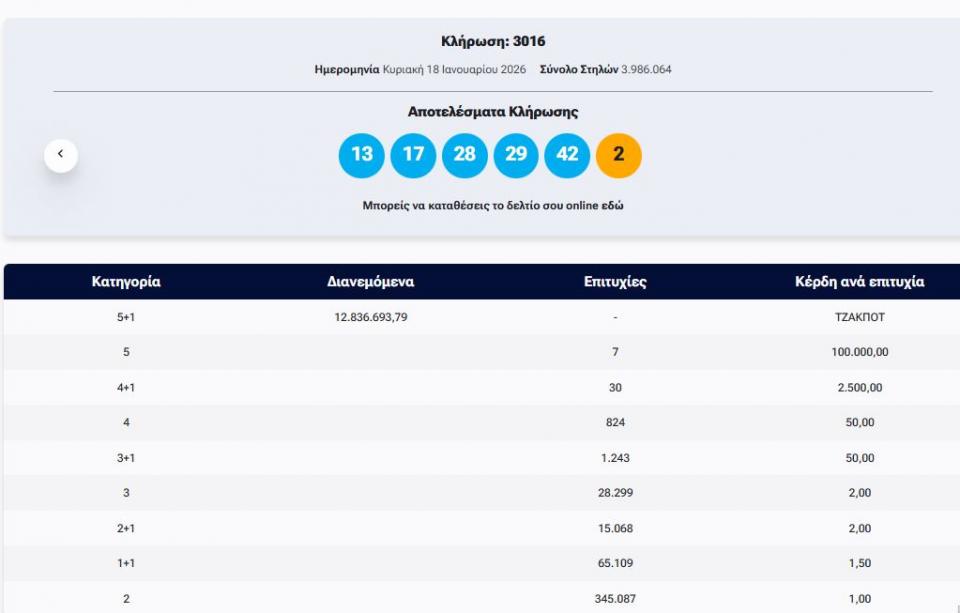 Κλήρωση Τζόκερ 3016 (18/1/2026): Αυτοί είναι οι τυχεροί αριθμοί που κερδίζουν