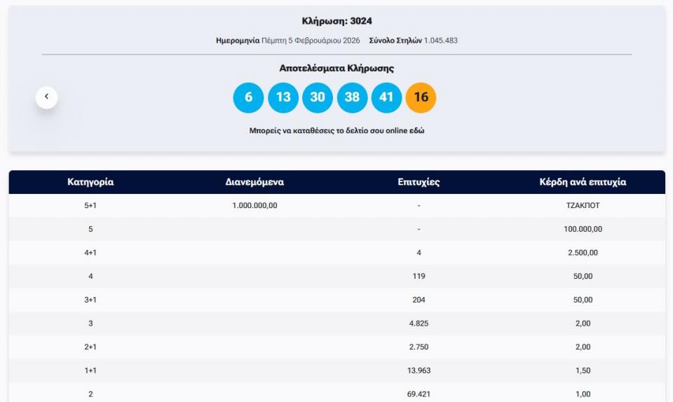 Κλήρωση Τζόκερ 3024 (5/2/2026): Αυτοί είναι οι τυχεροί αριθμοί που κερδίζουν
