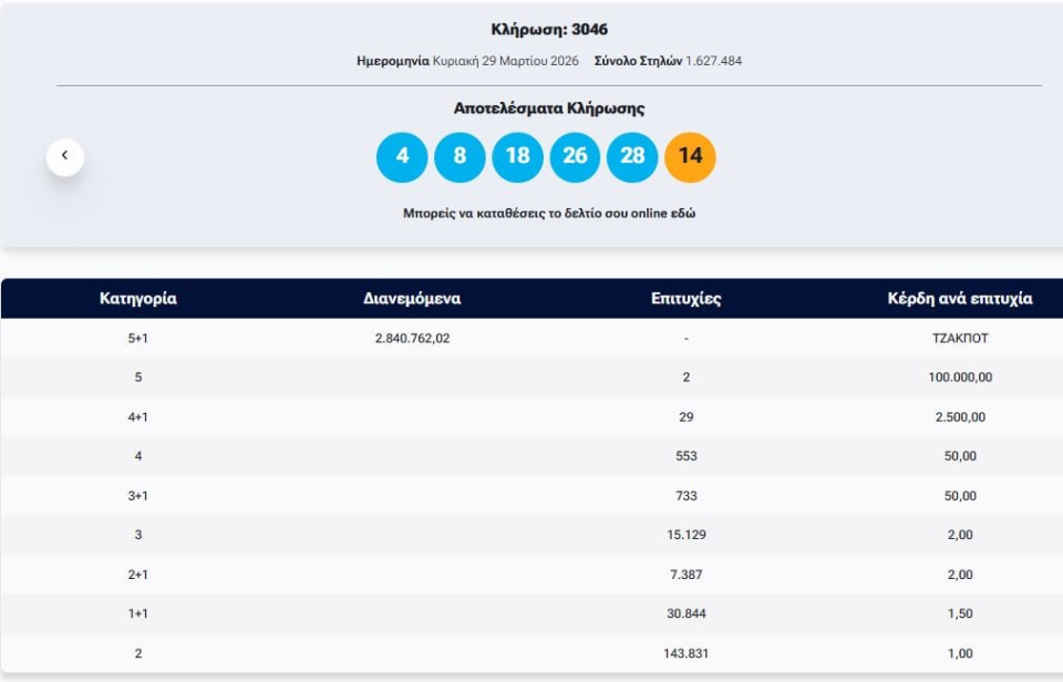 Κλήρωση Τζόκερ 3046 (29/3/2026): Αυτοί είναι οι τυχεροί αριθμοί που κερδίζουν