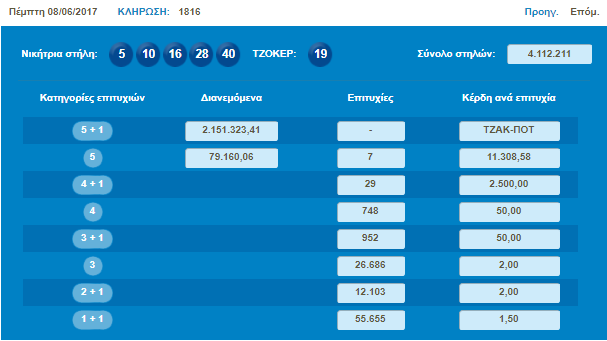 Στην προηγούμενη κλήρωση της Πέμπτης (08/06/17) σημειώθηκε!