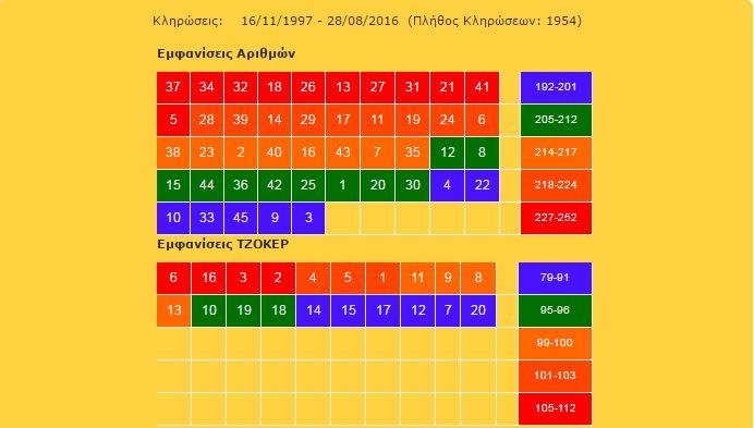 Το μπλε χρώμα σημαίνει ότι είναι λιγότερες οι φορές που έχει εμφανιστεί ο συγκεκριμένος αριθμός, ενώ όπου βλέπετε το κόκκινο είναι οι περισσότερες φορές. Αριστερά βλέπετε τους αριθμούς που αντιστοιχούν στο κάθε χρώμα, δηλαδή πόσες φορές έχει εμφανιστεί ο κάθε αριθμός στην περίοδο 16/11/1997 - 28/08/2016
