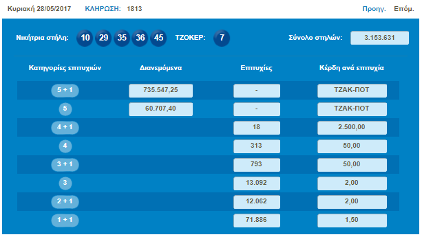 Στην προηγούμενη κλήρωση της Κυριακήςς (28/05/17) σημειώθηκε Τζακ Ποτ!