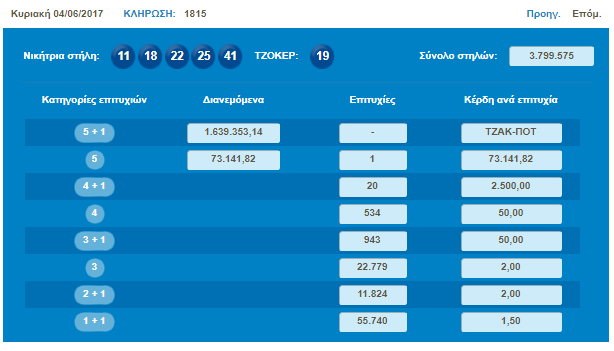 Στην προηγούμενη κλήρωση της Κυριακής (04/06/17) σημειώθηκε Τζακ Ποτ!