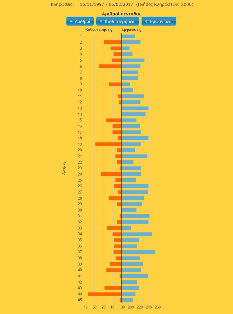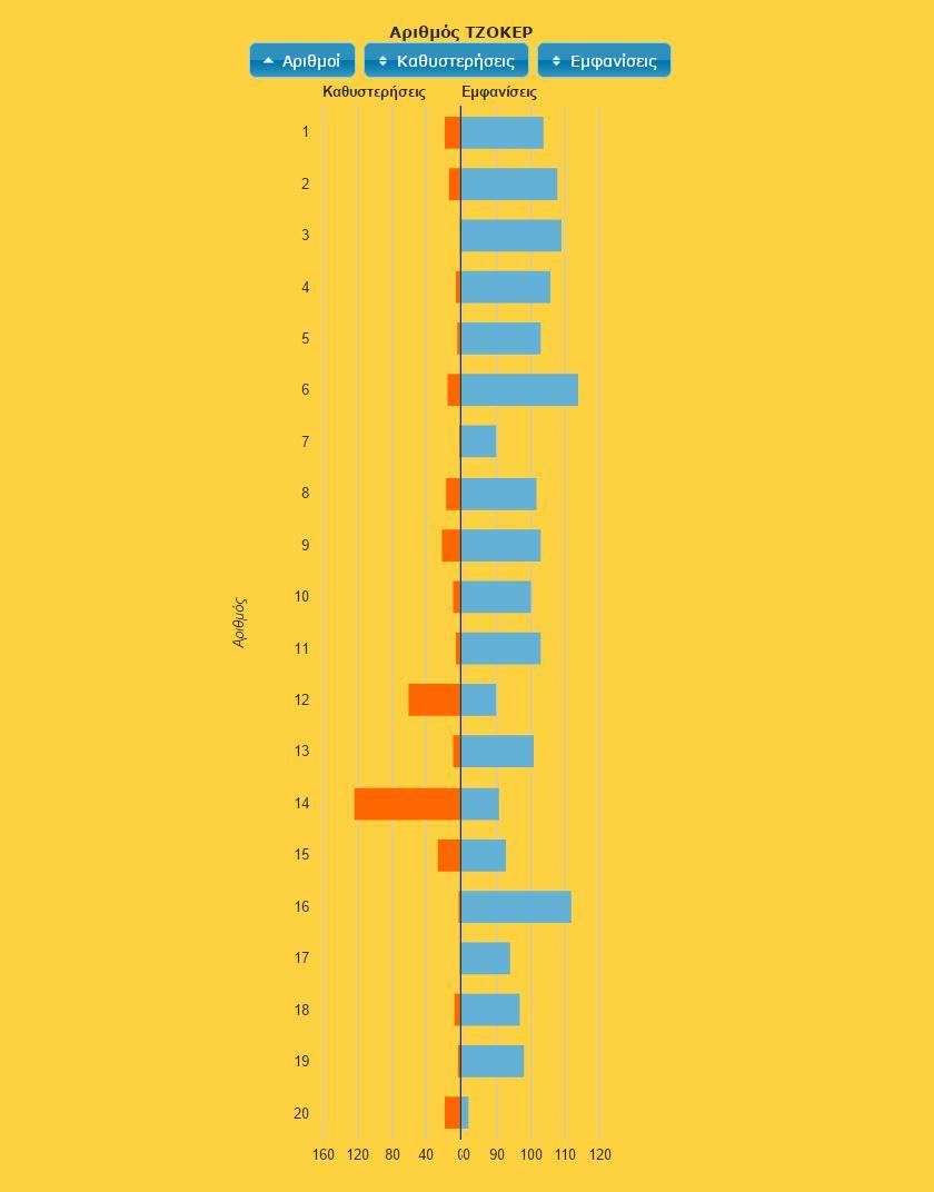 Για να αυξήσετε τις πιθανότητες επιτυχίας καλό θα είναι να ρίξετε μια ματιά στους αριθμούς που βγαίνουν συχνά από την κληρωτίδα και σε αυτούς που παρουσιάζουν μικρές ή μεγάλες καθυστερήσεις .