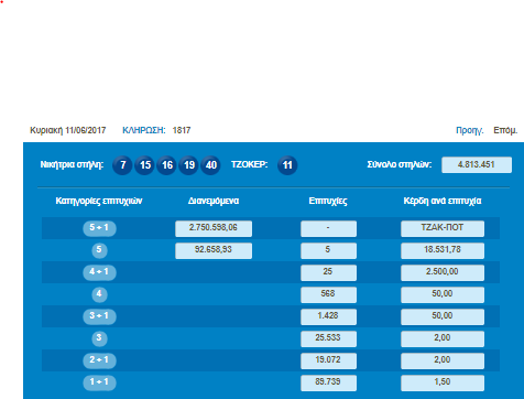 Στην προηγούμενη κλήρωση της Κυριακής (11/06/17) σημειώθηκε Τζακ Ποτ!