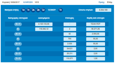 Στην προηγούμενη κλήρωση της Κυριακής (18/06/17) σημειώθηκε Τζακ Ποτ!