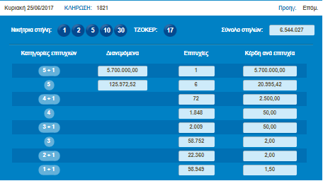 Ένα τυχερό δελτίο βρέθηκε στην1η κατηγορία (5+1 ) κατά την προηγούμενη διαλογή της 1821ης κλήρωσης του ΤΖΟΚΕΡ την Κυριακή 25/06, και κέρδισε το ποσό των € 5.700 .000!
