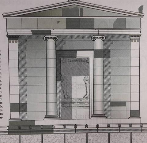 Τεραστίου μεγέθους, με γλυπτές συνθέσεις και πλούσιο εναέτιο διάκοσμο ήταν και η εξωτερική πρόσοψη του ταφικού μνημείου, όπως αποκαλύπτει με συνέντευξή του στο Βήμα της Κυριακής ο αρχιτέκτοντας της ανασκαφής στον Τύμβο Καστά, κ. Μιχάλης Λεφαντζής. Πρόκειται για το περίφημο δίστυλο εν παραστάσι, μπροστά από τις Σφίγγες και τα σκαλοπάτια της εισόδου του τάφου, το οποίο έφτανε ως τον περίβολο, ήταν σε κοινή θέα και αποτελούσε μεγαλοπρεπή κατασκευή όσο λειτουργούσε το ταφικό μνημείος ως ηρώο.