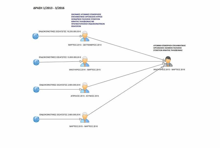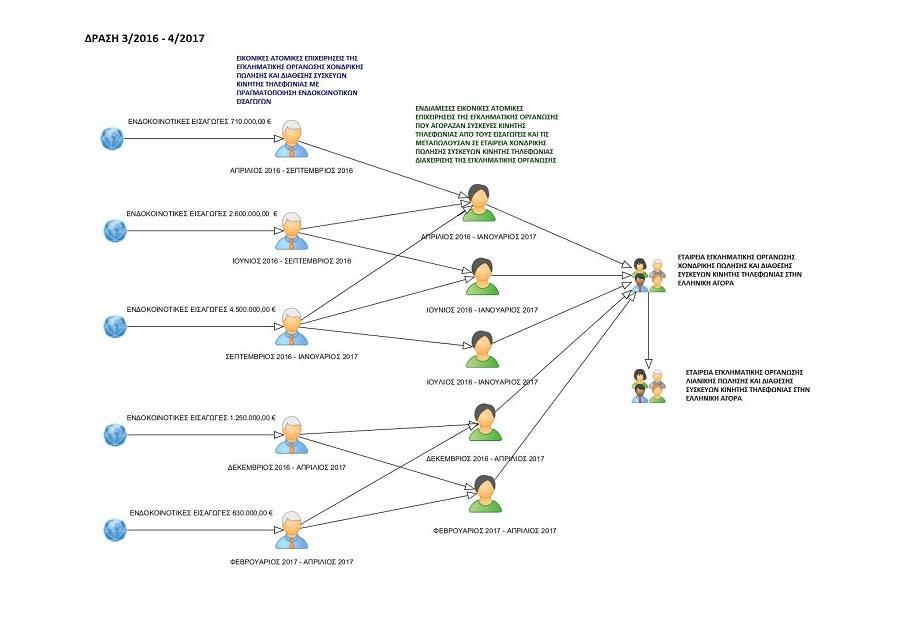 Μάλιστα, ένα από τα αρχηγικά μέλη είχε αναπτύξει επιχειρηματική συνεργασία με πολυάριθμες εταιρείες που δραστηριοποιούνταν στο χονδρικό εμπόριο ειδών κινητής τηλεφωνίας και άλλων ηλεκτρονικών προϊόντων, οι οποίες είχαν τις έδρες τους σε χώρες Κ-Μ της Ευρωπαϊκής Ένωσης και είχαν την έγκριση για πραγματοποίηση ενδοκοινοτικών παραδόσεων στη χώρα μας.