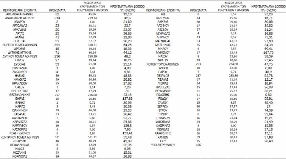 Αναλυτικά η κατανομή των κρουσμάτων ανά περιφερειακή ενότητα