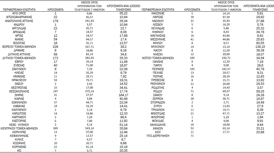 Αναλυτικά η κατανομή των κρουσμάτων ανά περιφερειακή ενότητα