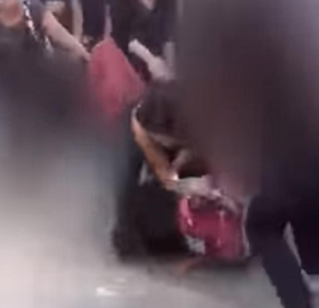 Κάποια στιγμή η κοπέλα της αρπάζει βίαια το κεφάλι και της το χτυπά στο πεζοδρόμιο, ενώ οι μαθητές που βρίσκονται μπροστά στο περιστατικό να της ζητούν να σταματήσει.