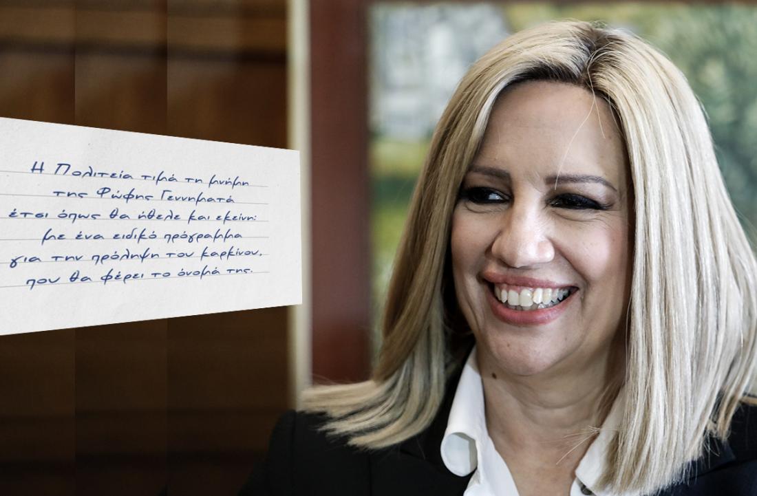 «Η Πολιτεία τιμά τη μνήμη της Φώφης Γεννηματά έτσι όπως θα ήθελε και εκείνη: με ένα ειδικό πρόγραμμα για την πρόληψη του καρκίνου, που θα φέρει το όνομά της» αναφέρει σε ανάρτηση του στο Facebook ο πρωθυπουργός Κυριάκος Μητσοτάκης ανακοινώνοντας την έναρξη προγράμματος για την πρόληψη του καρκίνου.