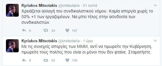 «Με τις συνεχείς απεργίες των ΜΜΜ, αντί να τιμωρείτε την κυβέρνηση, τιμωρείτε τους πολίτες που είναι οι μόνοι που δεν φταίνε. Σταματήστε» έγραψε ο πρόεδρος της Ν.Δ. σε ανάρτησή του στο Twitter. Επισήμανε παράλληλα την ανάγκη αλλαγής του συνδικαλιστικού νόμου. «Καμία απεργία χωρίς το 50% +1 των εργαζομένων. Να μπει τέλος στην ασυδοσία των συνδικαλιστών» ανέφερε στο tweet του.