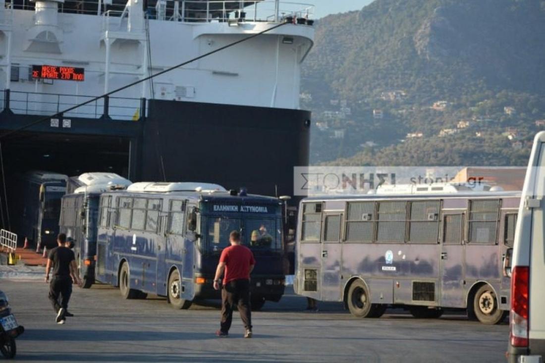 Ένα καράβι κατέφτασε από τον Πειραιά στο λιμάνι της Μυτιλήνης, με κλούβες των ΜΑΤ, θωρακισμένα οχήματα ρίψης νερού "Αίας" και περιπολικά.