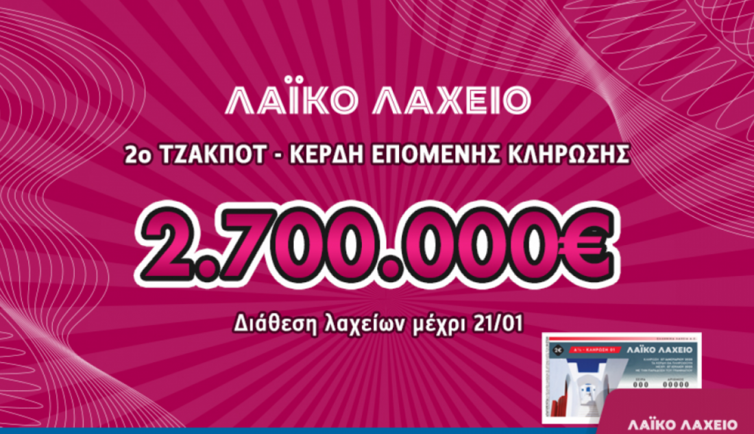 Λαϊκό Λαχείο Κλήρωση 3 Τρίτης 21 Ιανουαρίου 2020: Τουλάχιστον 2.700.000 ευρώ μοιράζει απόψε η 3η κλήρωση της Τρίτης 21 Ιανουαρίου 2020 του Λαϊκού Λαχείου του ΟΠΑΠ στους τυχερούς. Δείτε πρώτοι απόψε στις 22:00 στο thepressroom.gr τους τυχερούς αριθμούς.