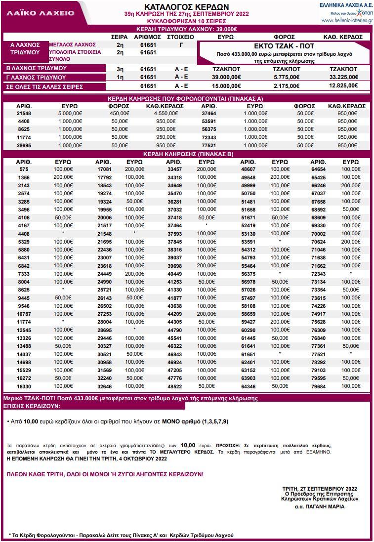 Τυχεροί λαχνοί από την κλήρωση 39η είναι: 61651, Σειρά 2η, Στοιχείο Γ.
