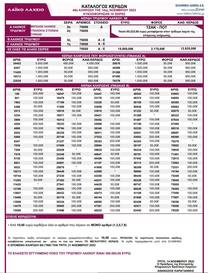 Πραγματοποιήθηκε η 46η κλήρωση για το Λαϊκό Λαχείο σήμερα Τρίτη 14/11/2023.