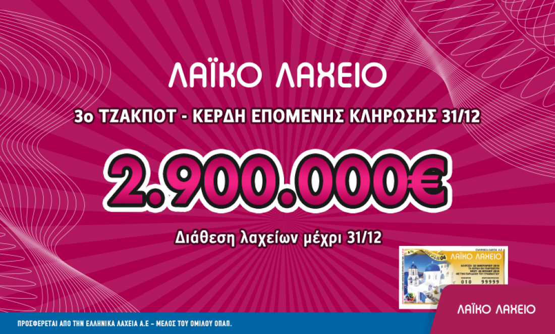 Λαϊκό Λαχείο - Κλήρωση 53 - Τρίτη 31 Δεκεμβρίου 2019: Τουλάχιστον 2.900.000 ευρώ μοιράζει απόψε η 53η κλήρωση του Λαϊκού Λαχείου του ΟΠΑΠ στους τυχερούς. Δείτε πρώτοι απόψε στις 21:00 στο thepressroom.gr τους τυχερούς αριθμούς, (η ΕΛΛΗΝΙΚΑ ΛΑΧΕΙΑ Α.Ε., σύμφωνα με τις διατάξεις του άρθρου 8 του Ειδικού Κανονισμού Διεξαγωγής και Ελέγχου του παιγνίου του Λαϊκού Λαχείου ανακοίνωσε την αλλαγή της ώρας μετάδοσης της 53ης Κλήρωσης του Λαϊκού Λαχείου της 31/12/2019, που ήταν προγραμματισμένη για τις 22:00. Η 53η Κλήρωση του Λαϊκού Λαχείου, θα διεξαχθεί στις 21:00).