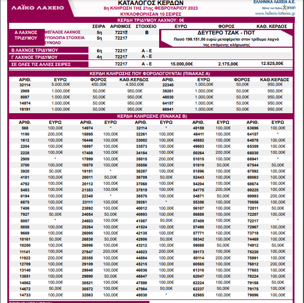 Λαικο Λαχειο: Πραγματοποιήθηκε η κλήρωση για το Λαικο λαχειο σήμερα Τρίτη 21 /2/2023. Δείτε τον πίνακα κερδών στη 8η κλήρωση.