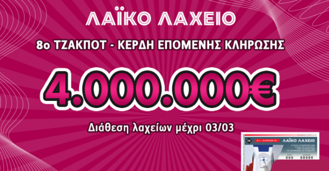 Λαϊκό Λαχείο - Κλήρωση 9η - Τρίτης 3 Μαρτίου 2020: Τουλάχιστον 4.000.000 ευρώ μοιράζει απόψε η 9η κλήρωση της Τρίτης 3 Μαρτίου 2020 του Λαϊκού Λαχείου του ΟΠΑΠ στους τυχερούς. Δείτε πρώτοι απόψε στις 22:00 στο thepressroom.gr τους τυχερούς αριθμούς.
