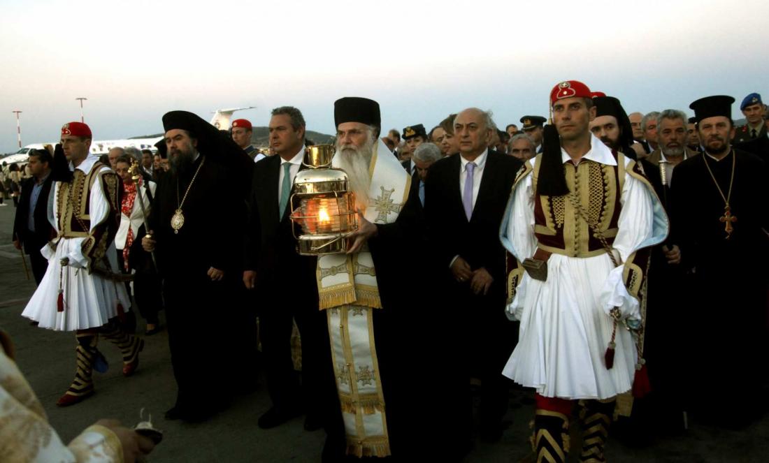Με τιμές αρχηγού κράτους Άγημα των Ενόπλων Δυνάμεων υποδέχθηκε επισήμως το Άγιο Φως, το οποίο «ταξίδεψε» από τα Ιεροσόλυμα στον Διεθνή Αερολιμένα «Ελ. Βενιζέλος», τη συνοδεία ελληνικής αντιπροσωπείας, με επικεφαλής τον υφυπουργό Εξωτερικών Γιάννη Αμανατίδη. Εν συνεχεία, σε κλίμα συγκίνησης, ο Έξαρχος του Παναγίου Τάφου στην Ελλάδα, αρχιμανδρίτης Δαμιανός παρέδωσε το Ανέσπερο Φως στον επιχώριο μητροπολίτη Μεσογαίας και Λαυρεωτικής Νικόλαο και στον εκπρόσωπο της κυβέρνησης, υπουργό Εθνικής Άμυνας, Πάνο Καμμένο, παρουσία πλήθους πιστών που το υποδέχθηκαν θερμά, εκπροσώπων της Εκκλησίας της Ελλάδος και του ΓΕΕΘΑ, κοριτσιών από το Λύκειο Ελληνίδων, προσκόπων και πολιτιστικών συλλόγων.