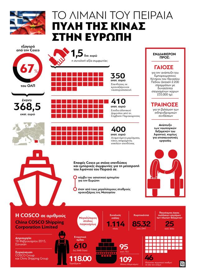 «H China Cosco Shipping θα κεφαλαιοποιήσει τη στρατηγική ευκαιρία που παρουσιάζει η πρωτοβουλία "One Belt, One Road", ξεκινώντας δυναμικά μια νέα σειρά επενδύσεων σε υποδομές και λειτουργίες, που θα εξορθολογίσουν πλήρως τις επιδόσεις του λιμανιού του Πειραιά και θα βοηθήσουν τον ΟΛΠ να αξιοποιήσει το μέγιστο των δυνατοτήτων του και να καταστεί ένα από τα κορυφαία λιμάνια στην Ευρώπη», είχε δηλώσει κατά την πρόσφατη επίσκεψή του στην Αθήνα ο πρόεδρος της China COSCO Shipping Xu Lirong, αναφορικά με υπογραφή της συμφωνίας πώλησης του 67% των μετοχών του ΟΛΠ.