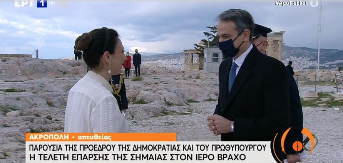 Ξεκίνησε η τελετή της επίσημης έπαρσης της σημαίας στον Ιερό Βράχο της Ακρόπολης, στην οποία θα παραστεί η Πρόεδρος της Δημοκρατίας Κατερίνα Σακελλαροπούλου και ο πρωθυπουργός Κυριάκος Μητσοτάκης.