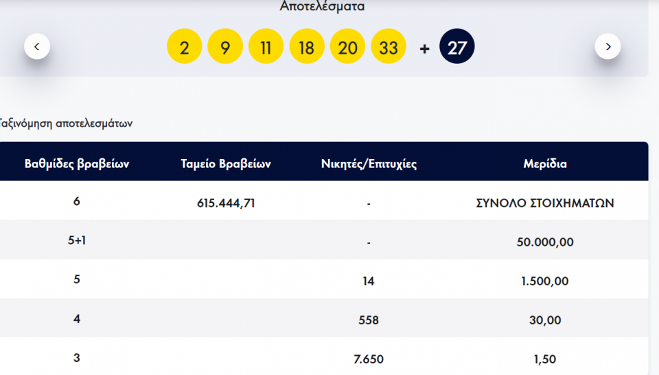 Οι έξι τυχεροί αριθμοί της κλήρωσης 2312 είναι: 2, 9, 11, 18, 20, 33